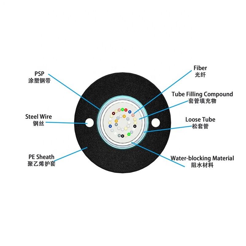 250μm 섬유는고 계수 플라스틱으로 만들어진 루즈 튜브에 위치됩니다. 튜브는 방수 충전용 콤파운드로 채워집니다. 튜브는 경도로 PSP의 레이어로 싸여집니다. PSP와 루즈 튜브 사이에 워터-블로킹 재료는 더 케이블을 소형이고 방수된 채로 유지하는데 이용됩니다. 두 평행한 강선은 강철 줄자에서 양측에 위치합니다. 평행한 강선은 양측 테이프에 위치합니다. 더 케이블은 폴리에틸렌 (PE) 덮개로 완료됩니다.